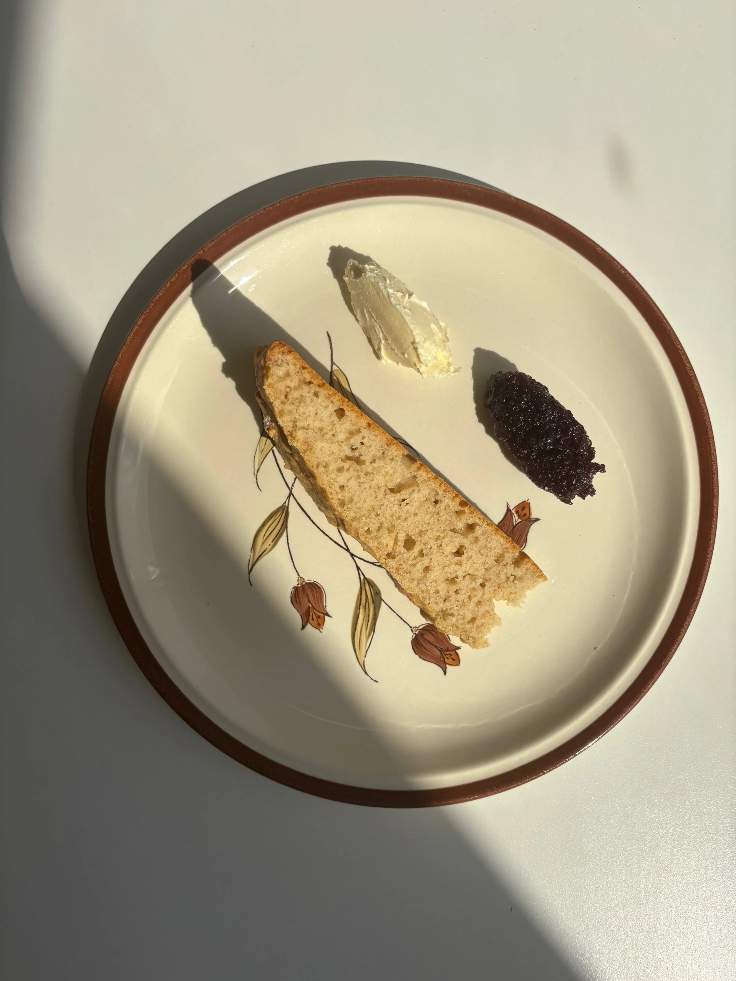 A decorative plate with a slice of bannock, a dollop of butter, and a serving of jam or preserves.