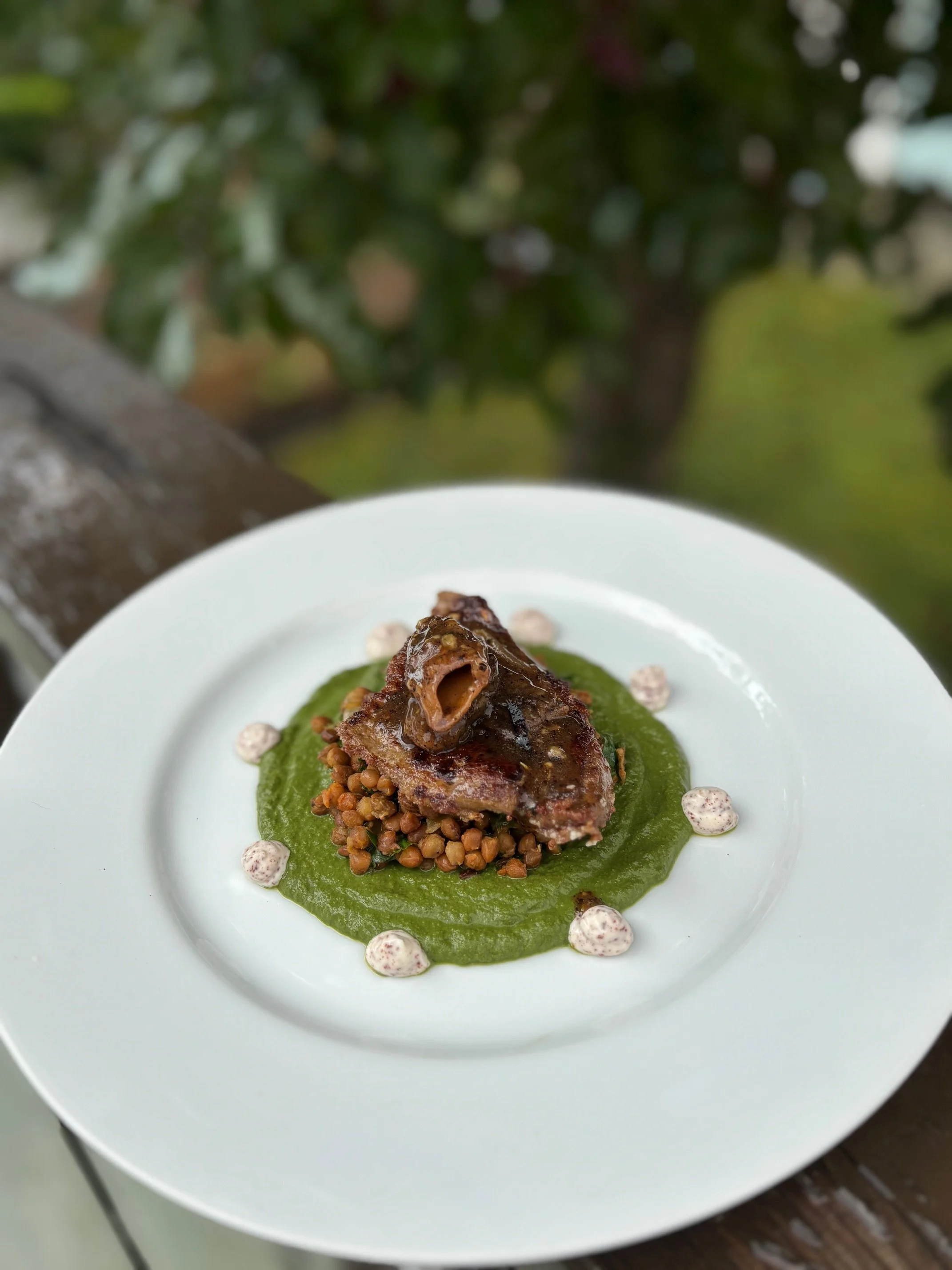 A gourmet dish featuring a braised meat cut with a bone, served on a bed of green puree and garnished with small dollops of a white sauce with red specks, presented on a white plate outdoors.