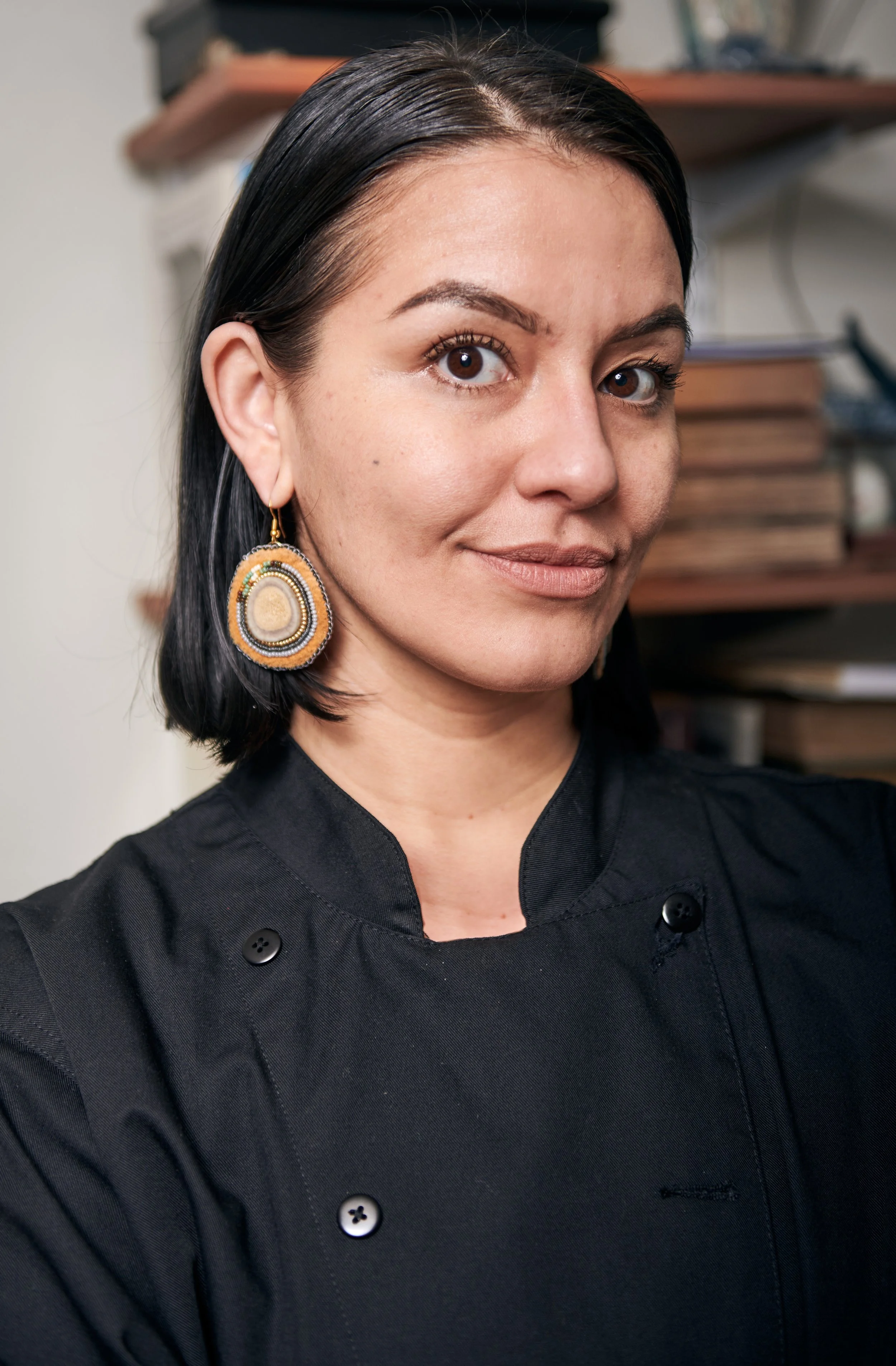 Close-up of a woman with dark hair, wearing earrings and a black chef's jacket, standing in a kitchen or workspace with shelves and books in the background.