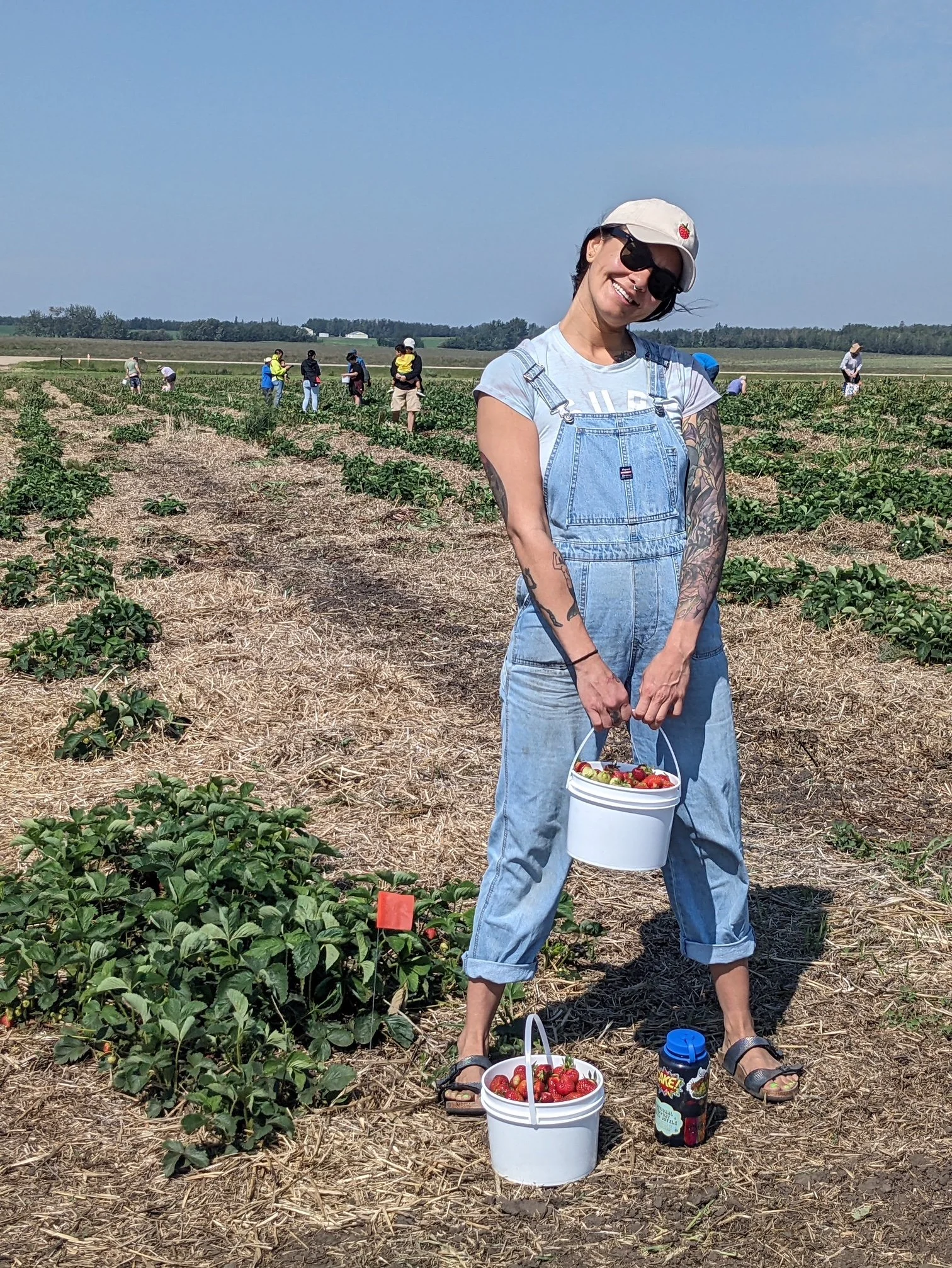 A woman standing in a strawberry field holding a white bucket of strawberries, with other people harvesting strawberries in the background. She is wearing sunglasses, a white cap, a light t-shirt, and denim overalls, smiling at the camera.